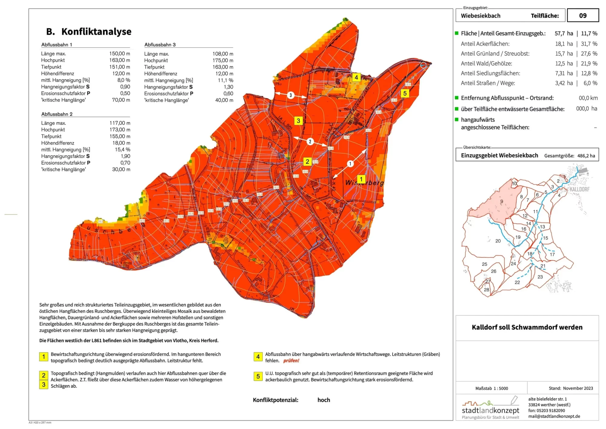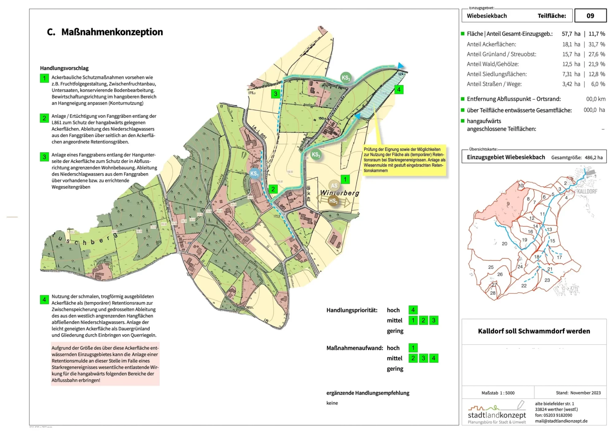 Das Handlungskonzept entwickelt für Kalldorf ein umfassendes Schwammdorf Prinzip, um Schäden durch Starkregen zu mindern. Analysiert werden Einzugsgebiete von Pferdebach und Wiebesiekbach, Erosionsgefährdung, Abflusswege und Siedlungsbereiche. Darauf aufbauend werden ackerbauliche, kulturtechnische und wasserbauliche Maßnahmen kombiniert: angepasste Fruchtfolgen, Grünstreifen, Hanggliederung, Retentionsgräben, Flutmulden und kaskadenförmige Retentionsbecken. Für den Ortskern werden Sofortmaßnahmen und eine Umgestaltung zentraler Flächen wie des „Alten Kruges“ zu hochwasserangepassten Grünbereichen vorgeschlagen.